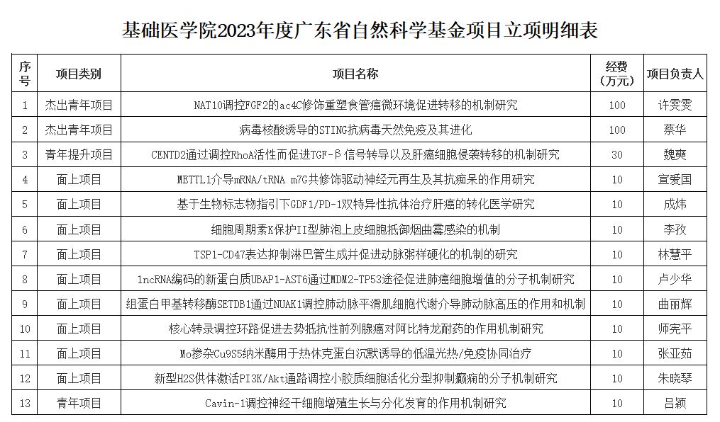 获立项13项,获资助金额310万元。其中,许雯雯教授和蔡华研究员获得杰出青年基金项目,魏奭教授获得青年提升项目,宣爱国教授等9人获得面上项目,吕颖博士获得联合基金青年项目立项资助。