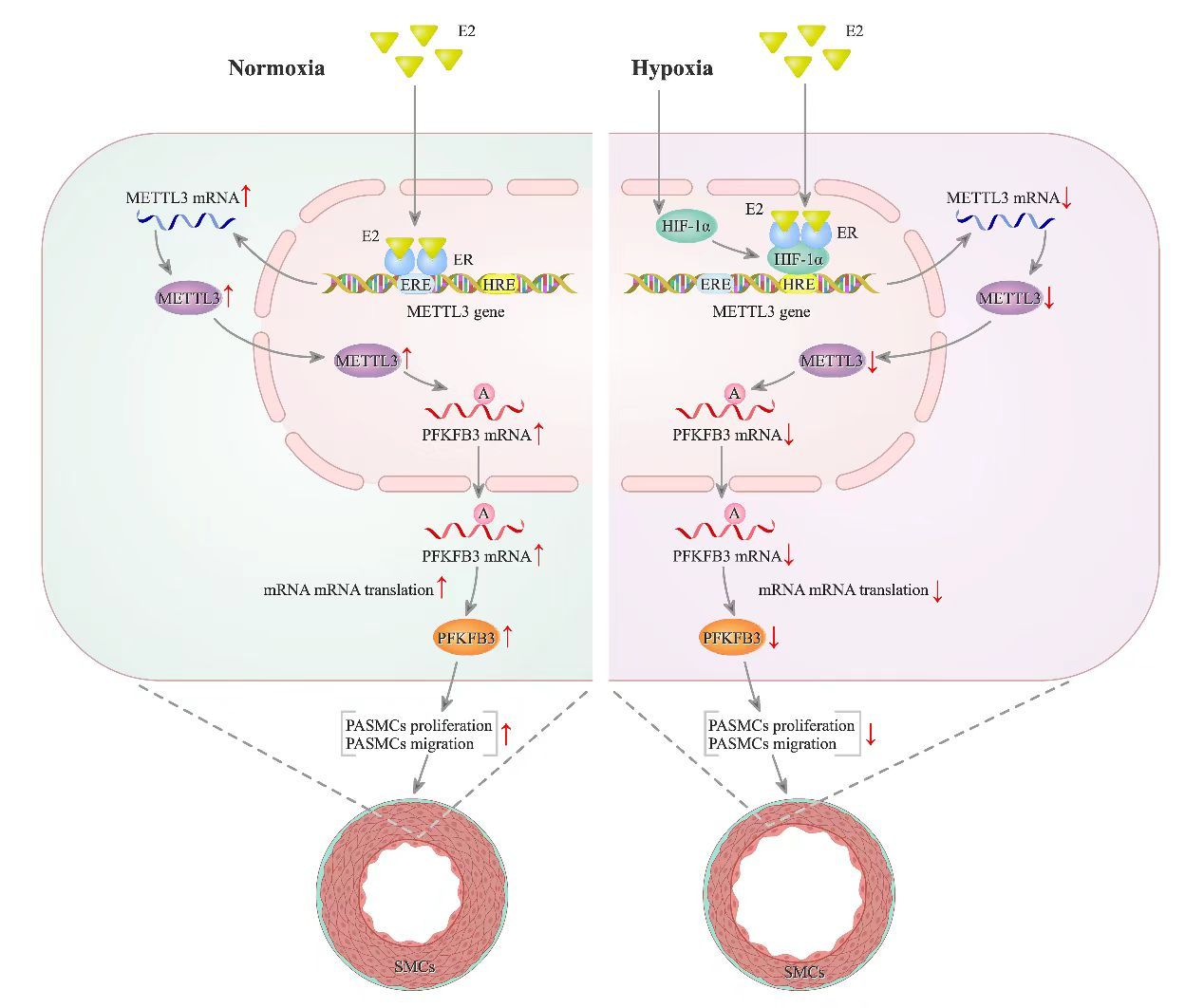 该研究在基础理论上阐释了“雌激素悖论”现象,具有重要的临床应用指导价值:对临床上常氧和低氧PH女性患者,应采用不同的治疗策略(雌激素替代疗法或拮抗疗法),或开发针对METLL3/PFKFB3的新型靶点,以期有效延缓女性PH发生发展。
