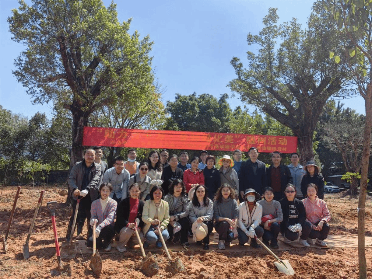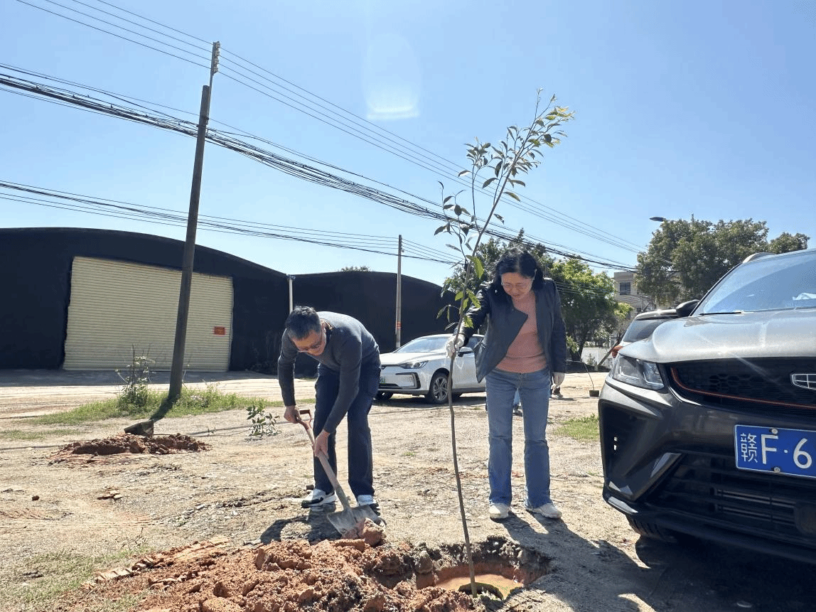 活动现场,大家三五人一组,干劲十足,在炙热的阳光下挥洒汗水。挥锹铲土、扶树填坑、培土加固……大家默契配合,经过一番辛勤劳作,80多株沉香树苗、紫荆树迎风挺立,展现出蓬勃生机,带来了浓浓绿意。
