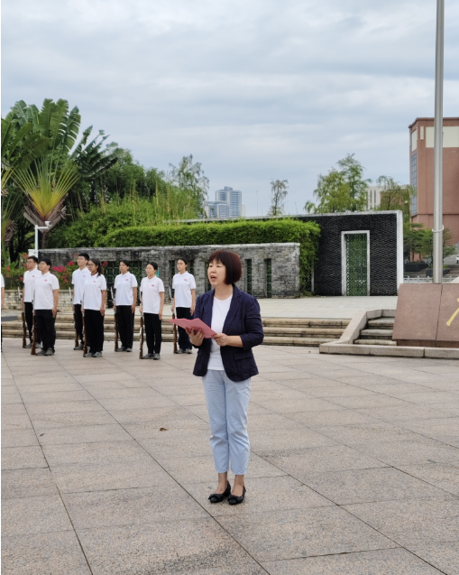 升旗仪式结束后,学院党委书记尹梅发表讲话。她回望了党和新中国的光辉历程,强调了红色政权、新中国以及我们今天幸福生活的来之不易。结合赵醒村校长在2024年9月开学典礼暨教师节表彰大会上的讲话,她对动漫屋