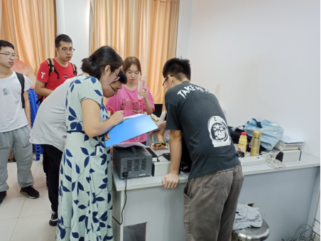 图为电子教研室王倩老师、刘洋老师对参赛作品进行评审