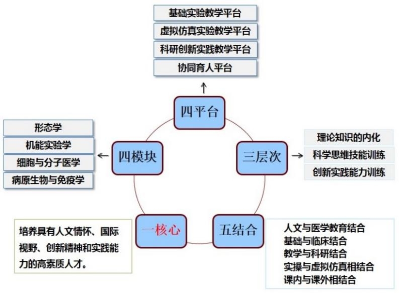 近年来,学院深化了“以人为本”的医学教学,探索“厚德为先、能力为重、课程为基”课程教学改革,创建了“一核多维、数元融动”的教学模式(见下图),旨在让医学生从踏入医门起即接受全方位的综合素质培养。