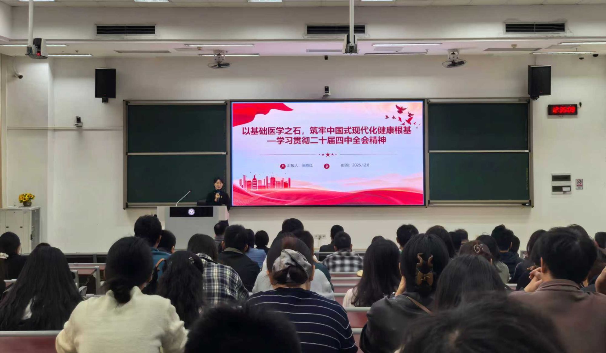为全面深入学习领会党的二十届四中全会精神,推动党的二十届四中全会精神在学院落地生根、入脑入心,12月8日中午,动漫屋 党委举行学习贯彻党的二十届四中全会精神专题辅导报告会,邀请学校党委宣讲组成员张晓红副教授作辅导报告。报告会由学院党委书记尹梅主持,全体师生党员参加。