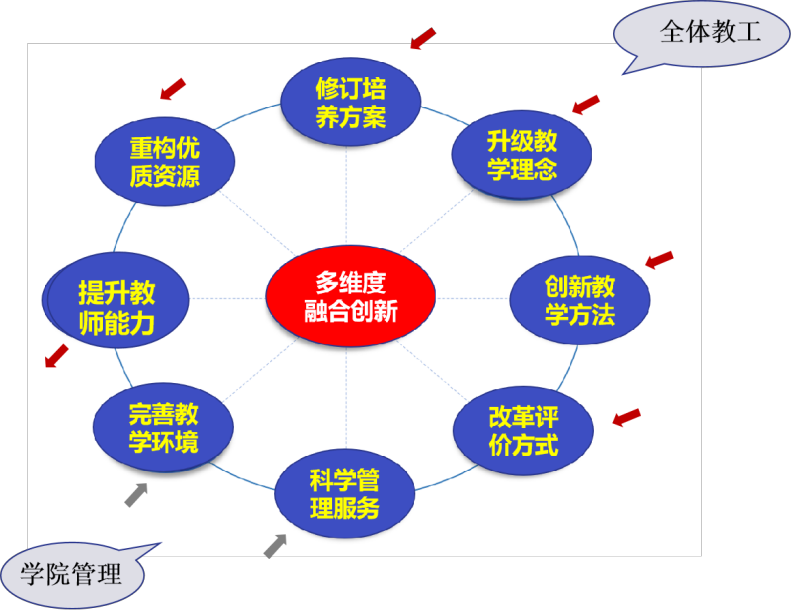 近年来,学院深化了“以人为本”的医学教学,探索“厚德为先、能力为重、课程为基”课程教学改革,创建了“一核多维、数元融动”的教学模式(见下图),旨在让医学生从踏入医门起即接受全方位的综合素质培养。